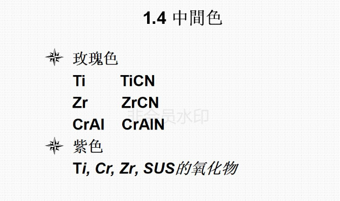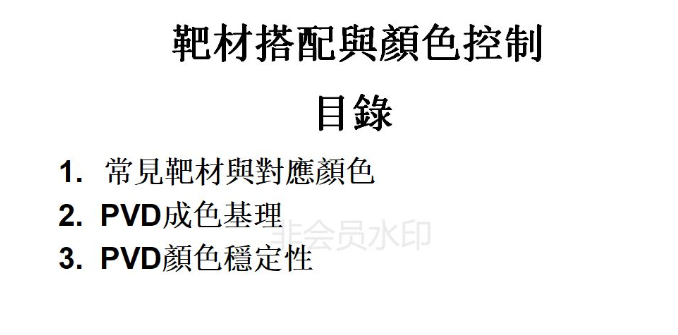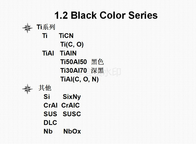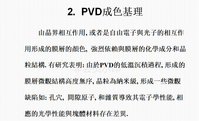 5)、PVD技術(shù)不僅提高了 鍍膜與基體材料的結(jié)合強(qiáng)度,涂層耗材種類(lèi)繁多,還有多元復(fù)合涂層,形成不同的顏色的表面效果。