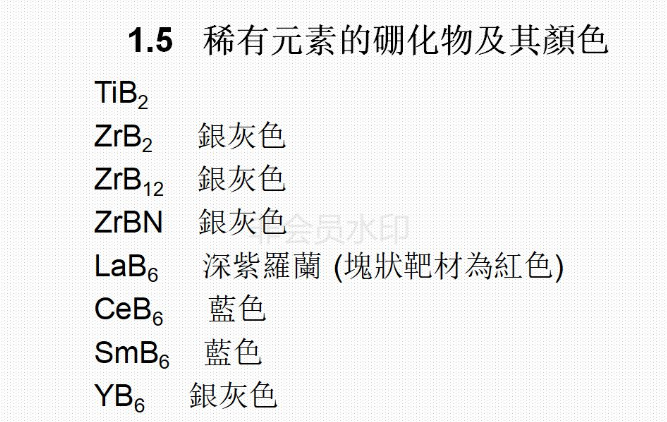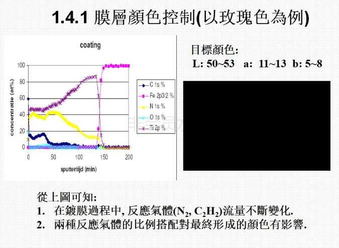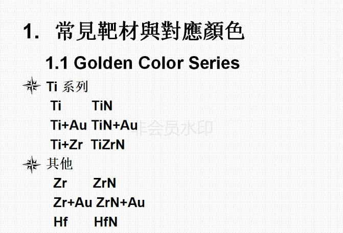 6)、目前能夠做出的膜層的顏色有深金黃色,淺金黃色,咖啡色、古銅色、灰色、黑色、灰黑色,七彩色等。通過(guò)控制鍍膜過(guò)程中的相關(guān)參數(shù),可以控制鍍出的顏色;鍍膜結(jié)束后可以用相關(guān)的儀器對(duì)顏色值進(jìn)行測(cè)量,使顏色得以量化,以確定所鍍出的顏色是否滿(mǎn)足要求。